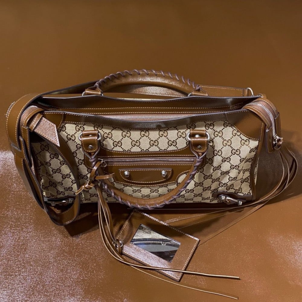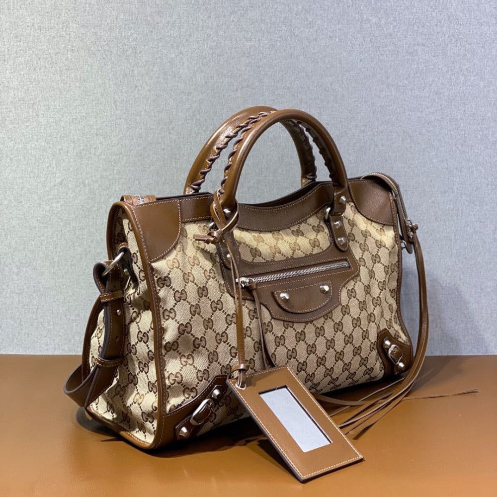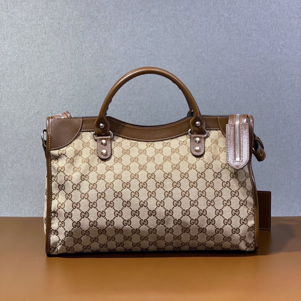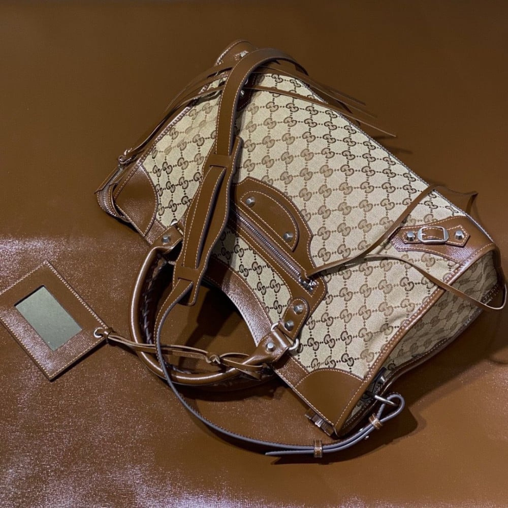 This stylish tote is part of The Hacker Project. It is crafted of Gucci Monogram coated canvas with a BB logo at the front. The top opens to a brown interior with a zipper pocket.
