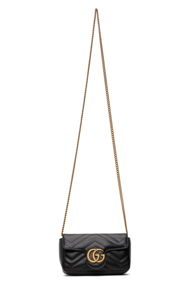 Quilted leather shoulder bag in black. Detachable curb chain shoulder strap with toggle fastening. Logo hardware at face. Quilted graphic at back face. Foldover flap with press-stud closure. Lobster clasp hardware and embossed leather logo patch at interior. Microsuede lining in pink. Antiqued gold-tone hardware. Approx.size 16.5 cm